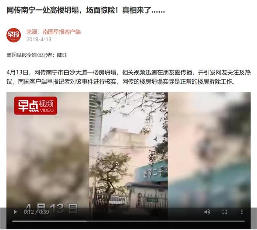 2019年,广西当地媒体《南国早报》记者走访发现,“网传的楼房坍塌实际是正常的楼房拆除工作。”