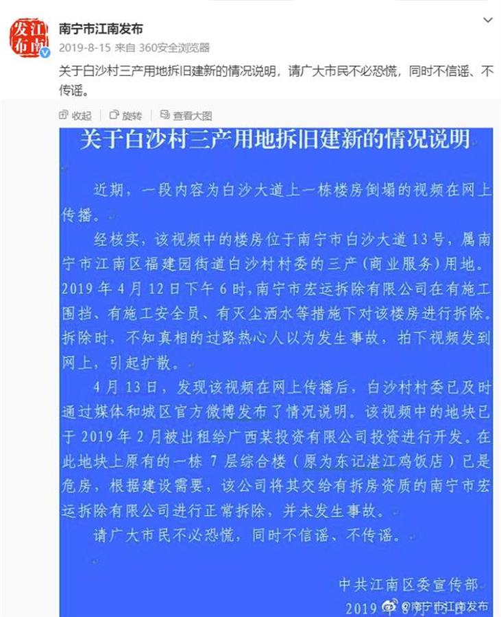 同日,广西壮族自治区南宁市江南区宣传部在其官方微博@南宁市江南发布 进行了《关于白沙村三产用地拆旧建新的情况说明》(后简称《说明》,编者注),称网传视频内容为“白沙大道上一栋楼房拆除的片段”。