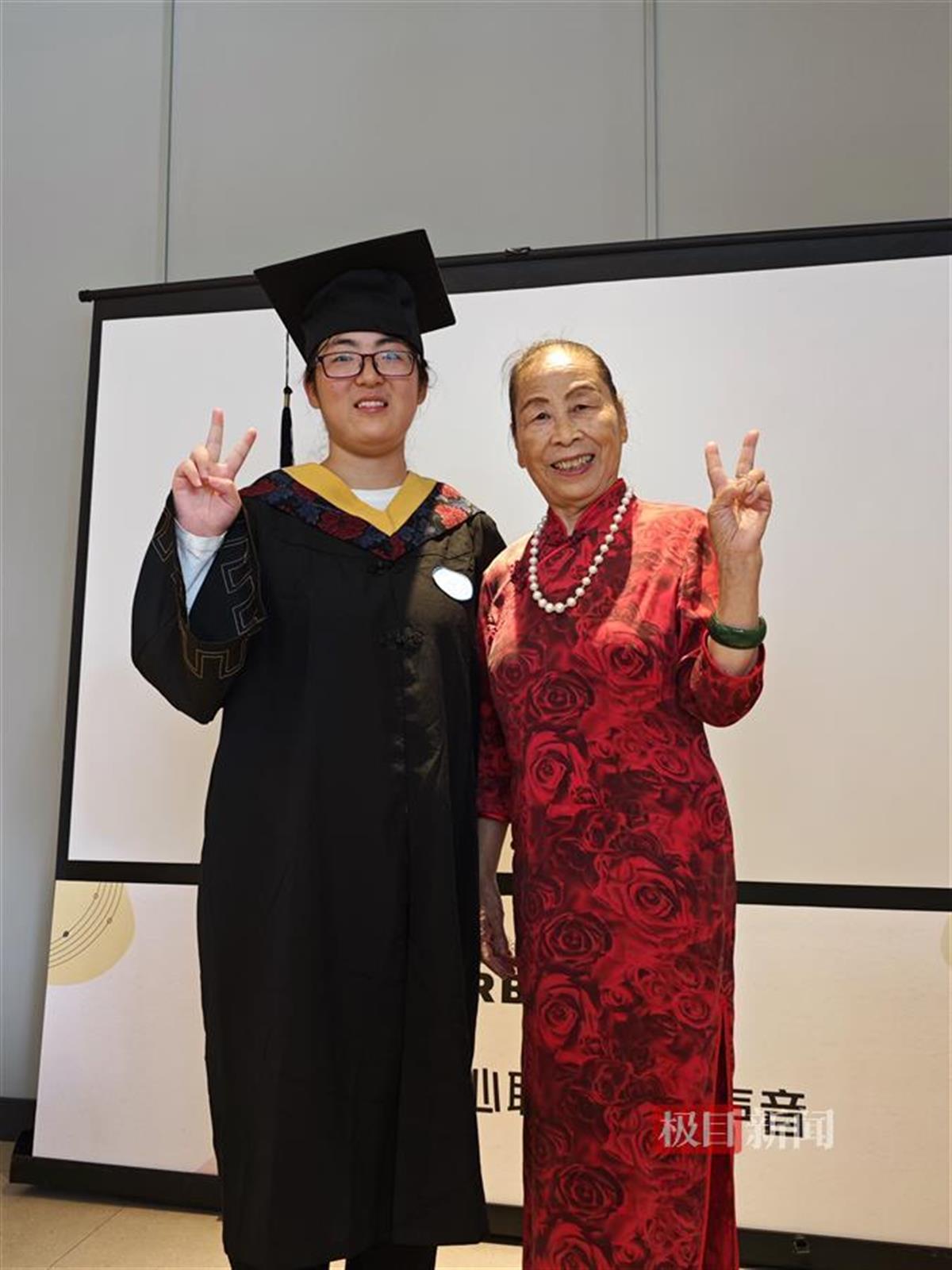 在“无声咖啡店”开业活动上,华中科技大学生物医学工程系大学生窦凌云穿着学士服与潘淑文拍了一张合影。
