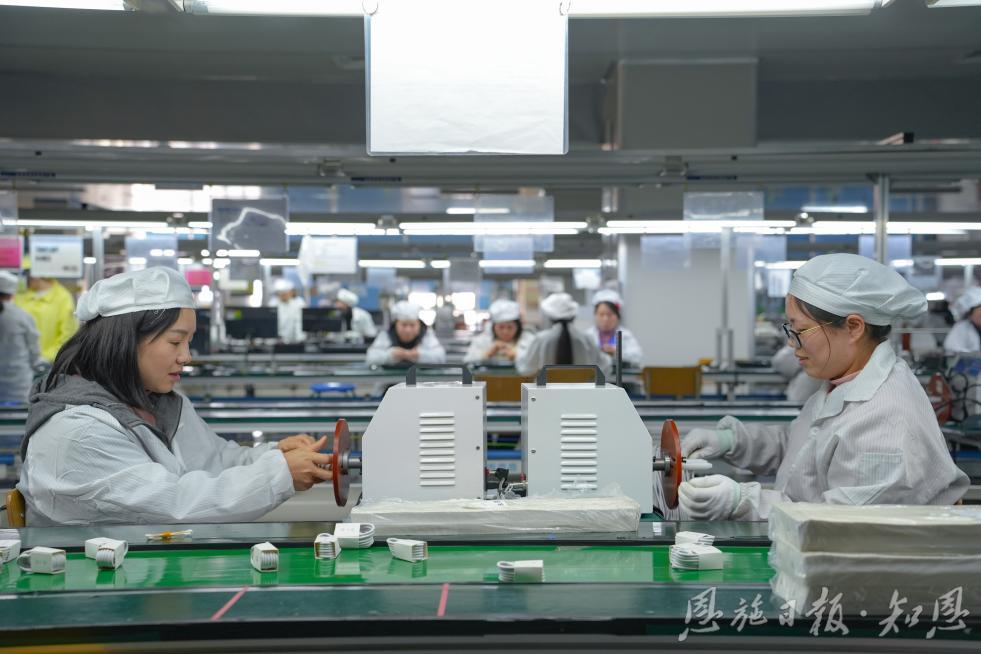 立讯精密工业(恩施)有限公司,工人有条不紊地操作,各生产环节衔接有序。恩施立讯投产以来,产值实现了快速增长,从2019年的6000多万元增长到2023年的15.8亿元,成功跃居恩施州年产值最大的制造业企业之列,让恩施人民在家门口实现就业增收。全媒体记者田景文 摄