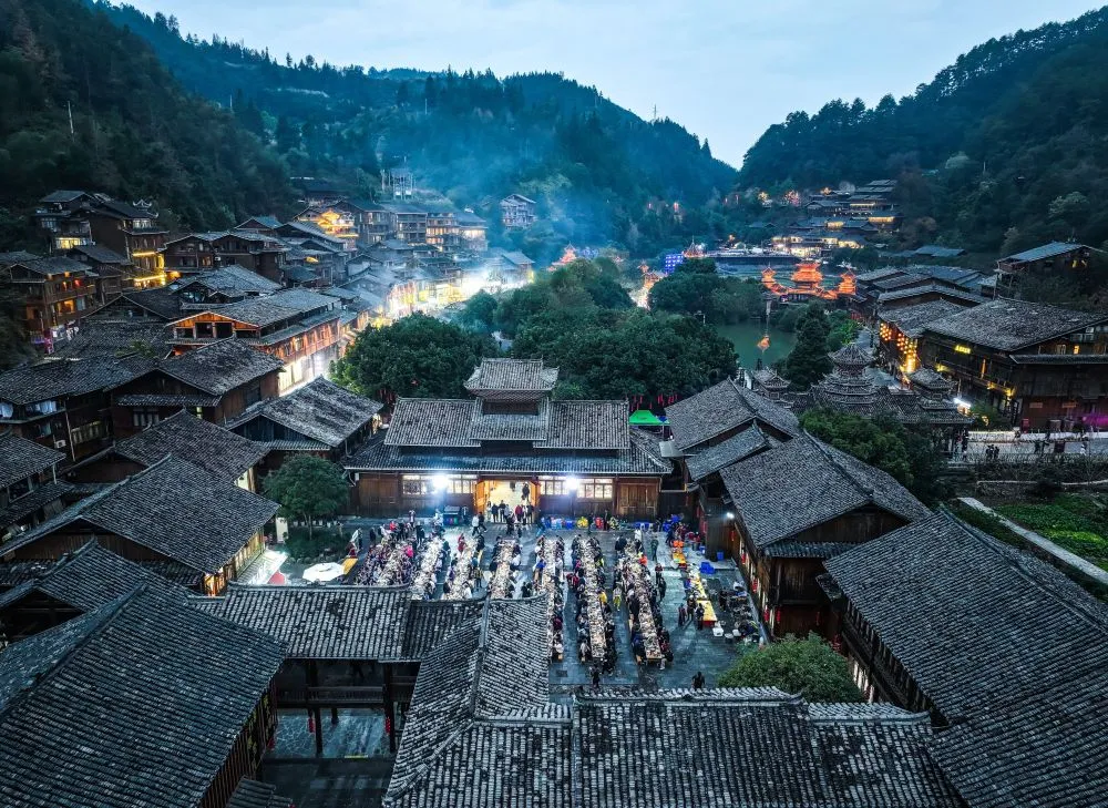2025年12月20日,在贵州省黎平县肇兴侗寨,侗族同胞与来宾在侗年活动中共享长桌宴(无人机照片)。新华社记者 杨文斌 摄