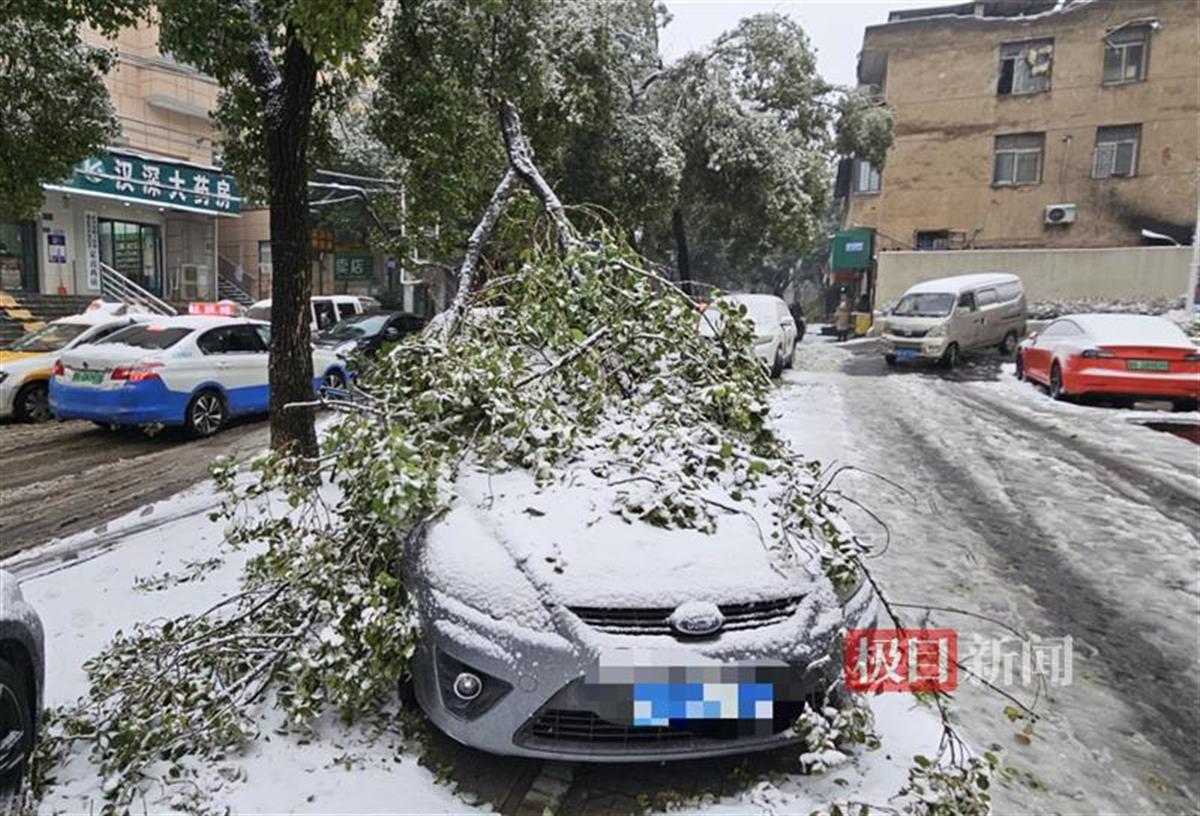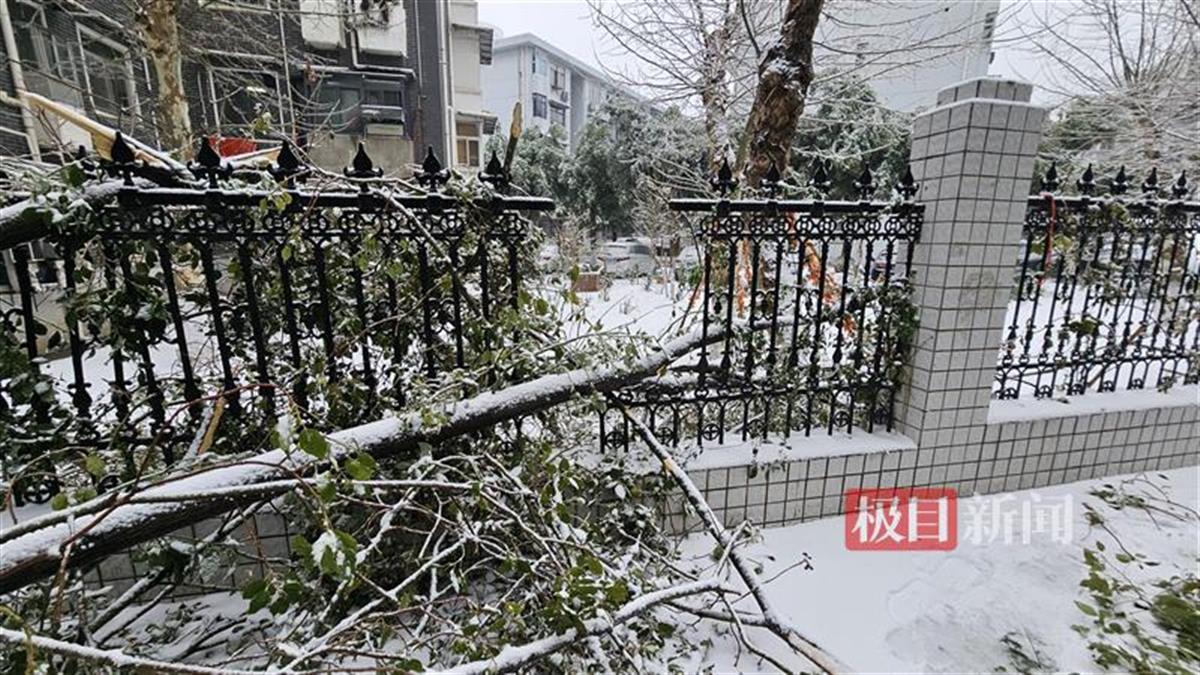 美丽的雪景却伴随着一系列麻烦事——许多树木的树枝无法承受冰和积雪的压力而被压断。在树木茂密的道路下,随处可见坠落的树枝,其中不乏碗口粗细、数米长的粗枝,坠落之后甚至能将路边的铁栅栏砸出一个大缺口。停在树下的车辆更是遭了殃,仅在武昌区黄鹂路附近,记者就发现了数辆私家车被行道树落下的粗枝砸中引擎盖或车顶。一辆丰田牌SUV就被落下的粗枝正中引擎盖,树枝枝繁叶茂十分沉重,有路人想尝试把此树枝拖走却未能拖动,引擎盖与树枝接触的部位已有轻微凹陷。还有一辆福特牌轿车则被树枝砸中了挡风玻璃,挡风玻璃全部被枝叶遮挡,损伤情况不明。由于道路拥堵,车主们都还未能赶到现场处理。