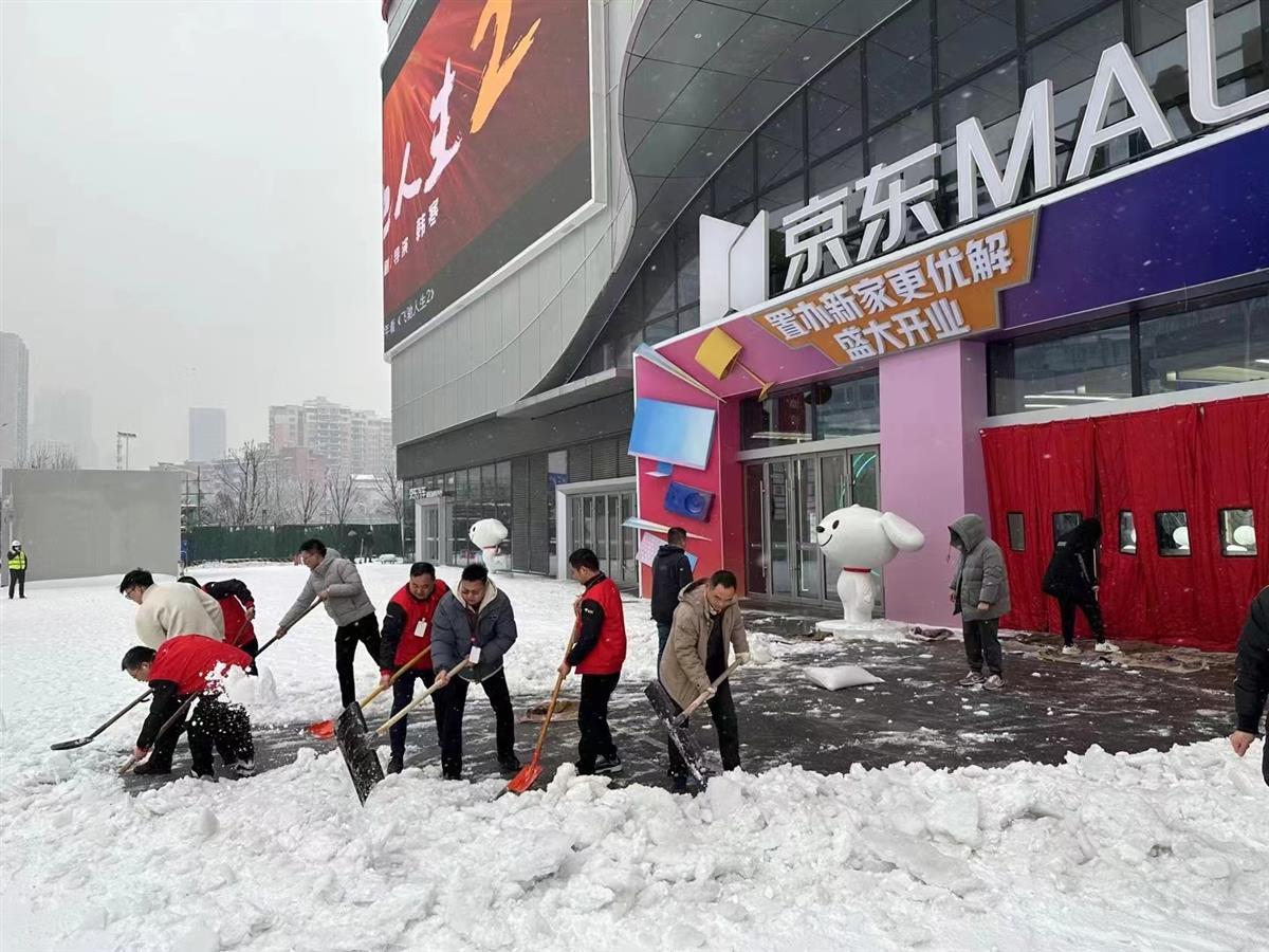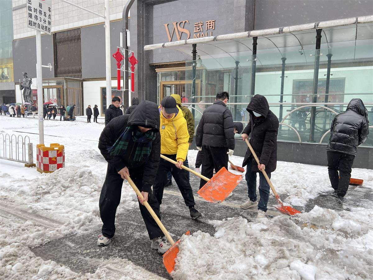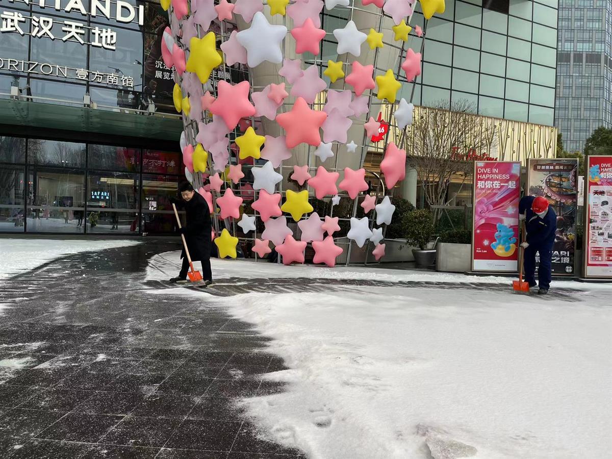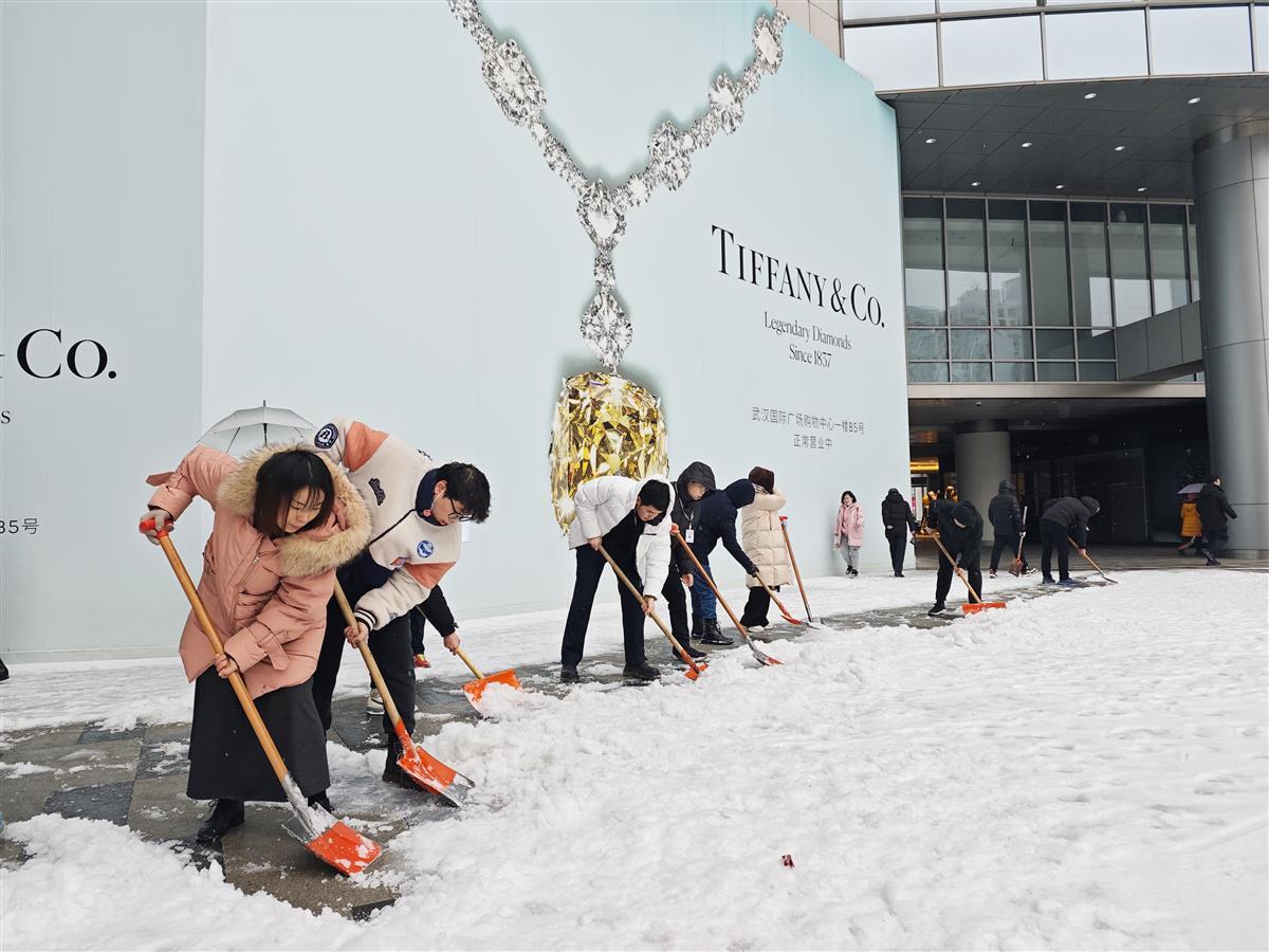 武商集团各购物中心、武汉恒隆广场、武汉大悦城等购物中心为道路除雪除冰,铺设防滑地垫,调控温度充分保暖,奉上姜丝可乐。
