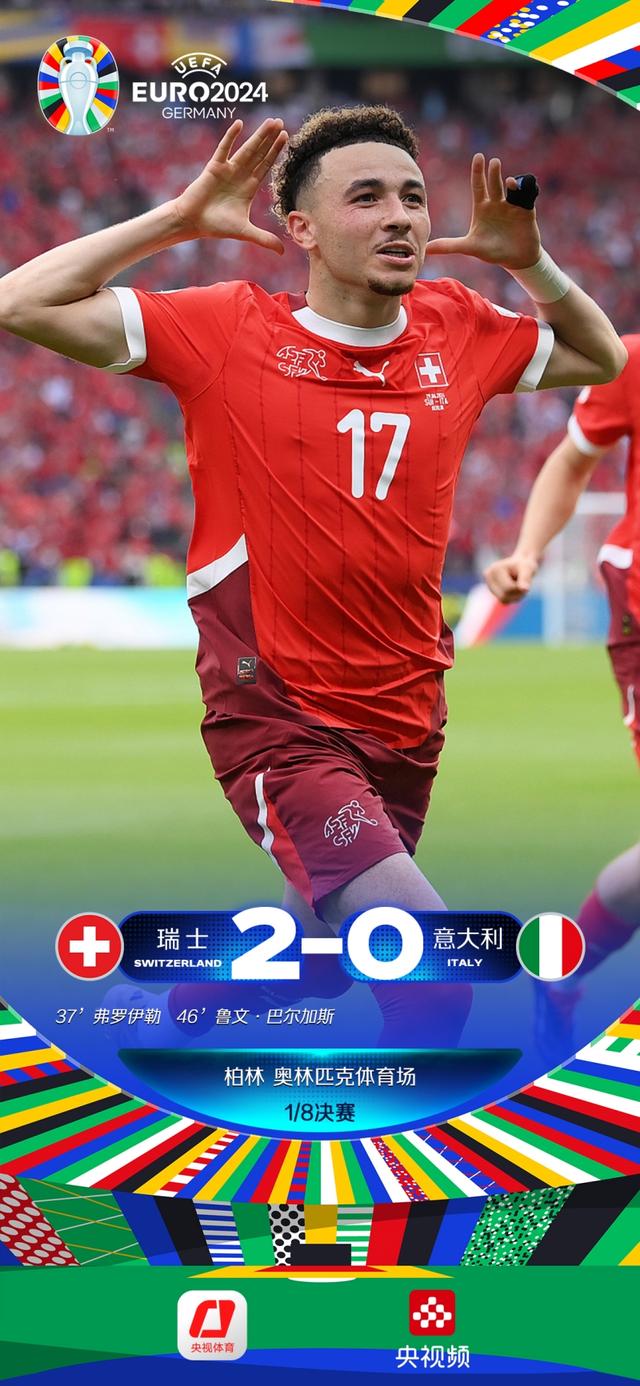 北京时间6月30日凌晨,2024年欧洲杯足球赛展开了淘汰赛阶段的较量,在首场1/8决赛中,凭借弗罗伊勒和巴尔加斯的进球,瑞士2-0击败卫冕冠军意大利,晋级八强。