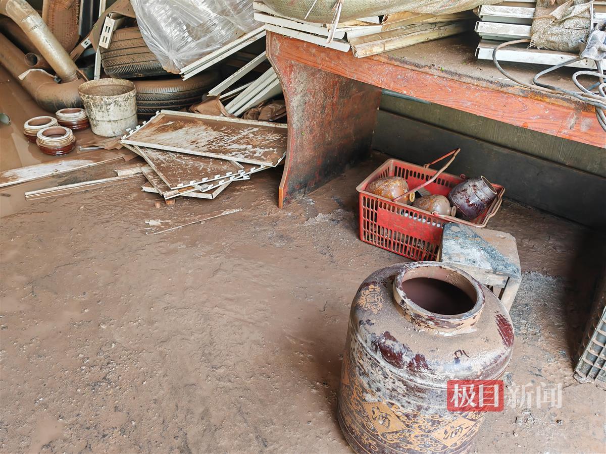 余老板告诉记者,积水最深时逼近他脖子处,墙上留下的洪水线清晰可见。店内的存酒损毁了几十坛,有些是随洪水漂走,有些是浮起后酒坛被撞裂,酒坊制酒设备也遭到损坏,粗略估算损失过百万元,“我在这个地方开店多年,从未遇到这么大的洪水,好多吨酒都没了。”
