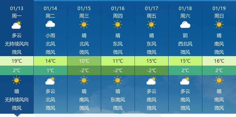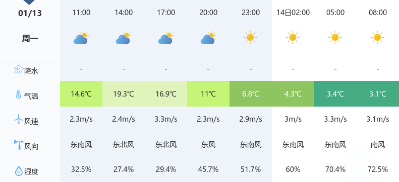 1月13日,咸宁天气以多云为主,白天微风,最高气温达到19℃,最低气温为2℃。空气湿度为47%,体感温度为4.3℃,空气质量良好。夜间天空晴朗,依旧保持微风状态。面对这样的温差变化,市民们出行时请携带外套,以防着凉。