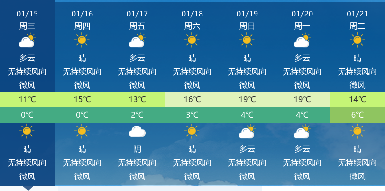 未来三天,恩施将迎来连续的晴朗天气。其中,16日白天和夜晚均为晴朗,最高气温15℃,最低气温0℃;17日白天多云,夜晚阴,最高气温13℃,最低气温2℃;18日全天晴朗,最高气温16℃,最低气温3℃。建议市民朋友们在晴朗天气下适当增加户外活动,但需注意防晒,涂抹防晒霜并佩戴太阳镜。