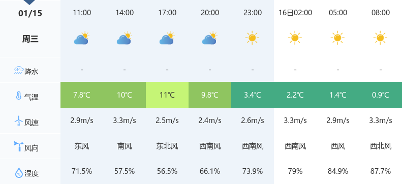今天是2025年1月15日,恩施白天天气为多云,最高气温11℃,最低气温0℃,风力微风,空气湿度84%,体感温度4.1℃。市民朋友们请注意保暖,外出时佩戴帽子和围巾以抵御寒冷。