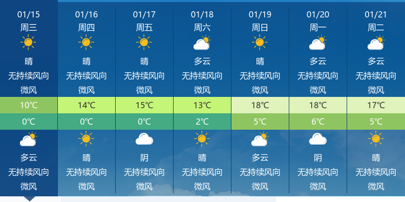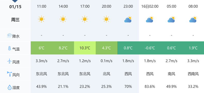 今天是2025年1月15日,荆州天气白天晴朗,夜晚多云,最高气温10℃,最低气温0℃,风力微风,空气湿度44%,体感温度0.3℃。市民朋友们请注意保暖,出行时可适当增加衣物,避免寒冷天气对身体的影响。