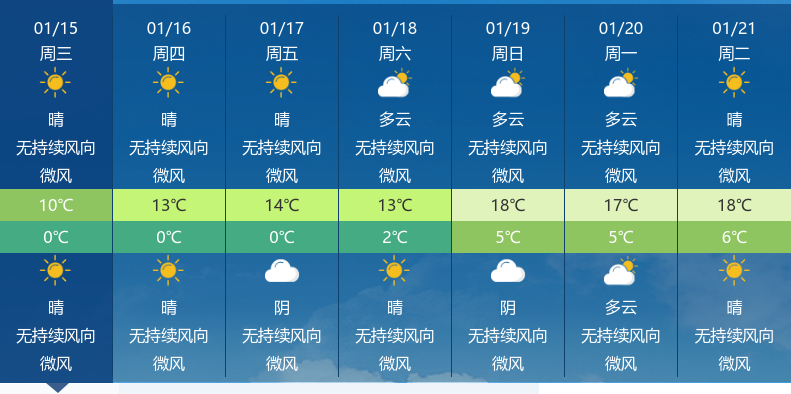 未来三天,仙桃的天气将继续保持晴好,1月16日白天和夜晚均为晴天,最高气温13℃,最低气温0℃;1月17日白天晴朗,夜晚转阴,最高气温14℃,最低气温0℃;1月18日白天多云,夜晚晴朗,最高气温13℃,最低气温2℃。请市民朋友们关注天气变化,早晚温差较大,建议适时调整着装,防止感冒。