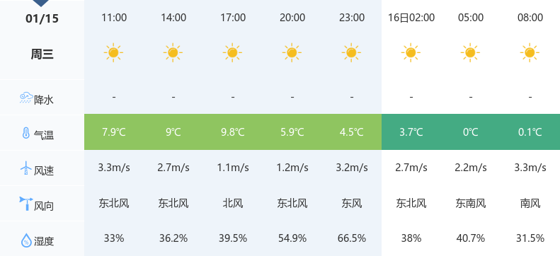 今天是2025年1月15日,仙桃天气晴朗,白天和夜晚均为晴天,最高气温10℃,最低气温0℃,风力为微风,空气湿度32%,体感温度-1.6℃,空气质量良。市民朋友们请注意保暖,外出时佩戴围巾和手套,避免长时间暴露在寒冷环境中。