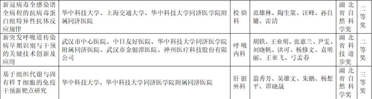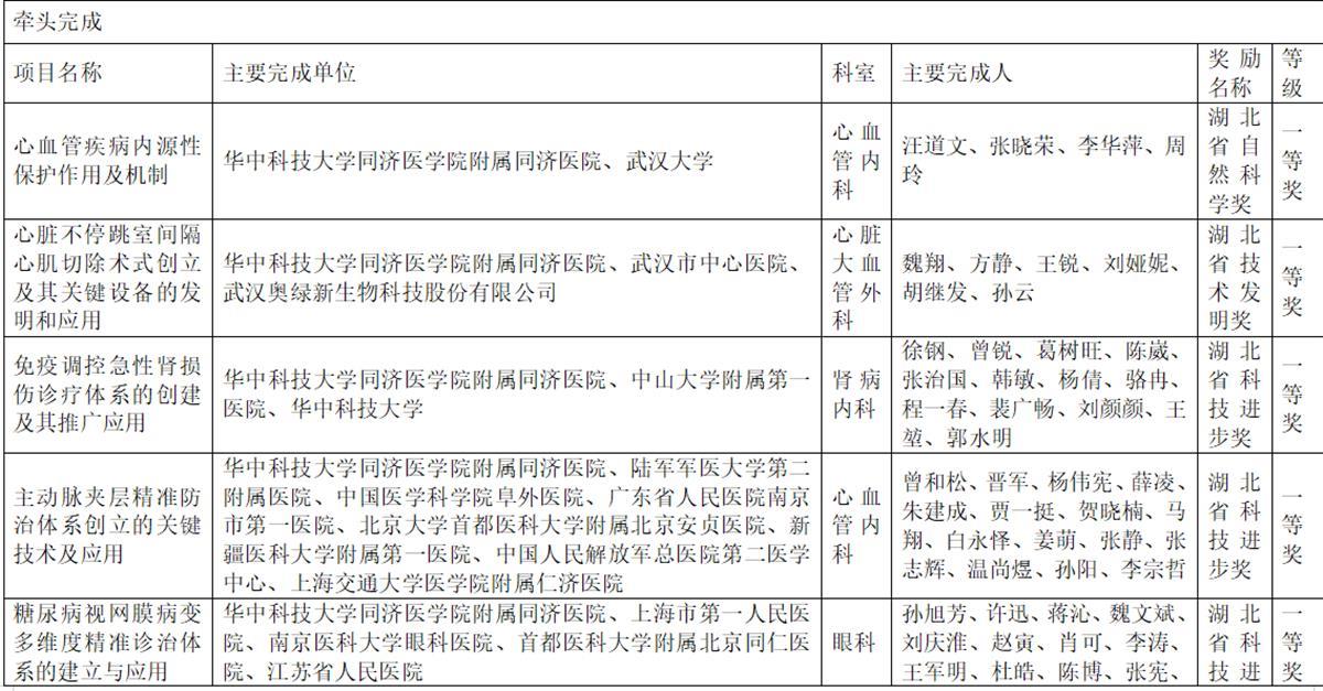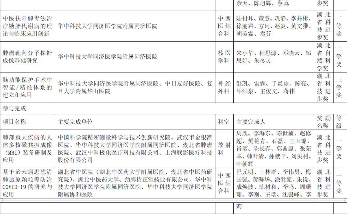 据悉,作为第一完成单位,同济医院中医科陆付耳教授团队“中医扶阳解毒法治疗糖脂代谢病的理论与临床应用创新”项目荣获湖北省科技进步奖二等奖;核医学科朱小华教授团队“肿瘤靶向分子探针成像基础研究”项目荣获湖北省自然科学奖三等奖;神经外科舒凯教授团队“脑功能保护手术中智能/精准体系的建立和应用”项目荣获湖北省科技进步奖三等奖。