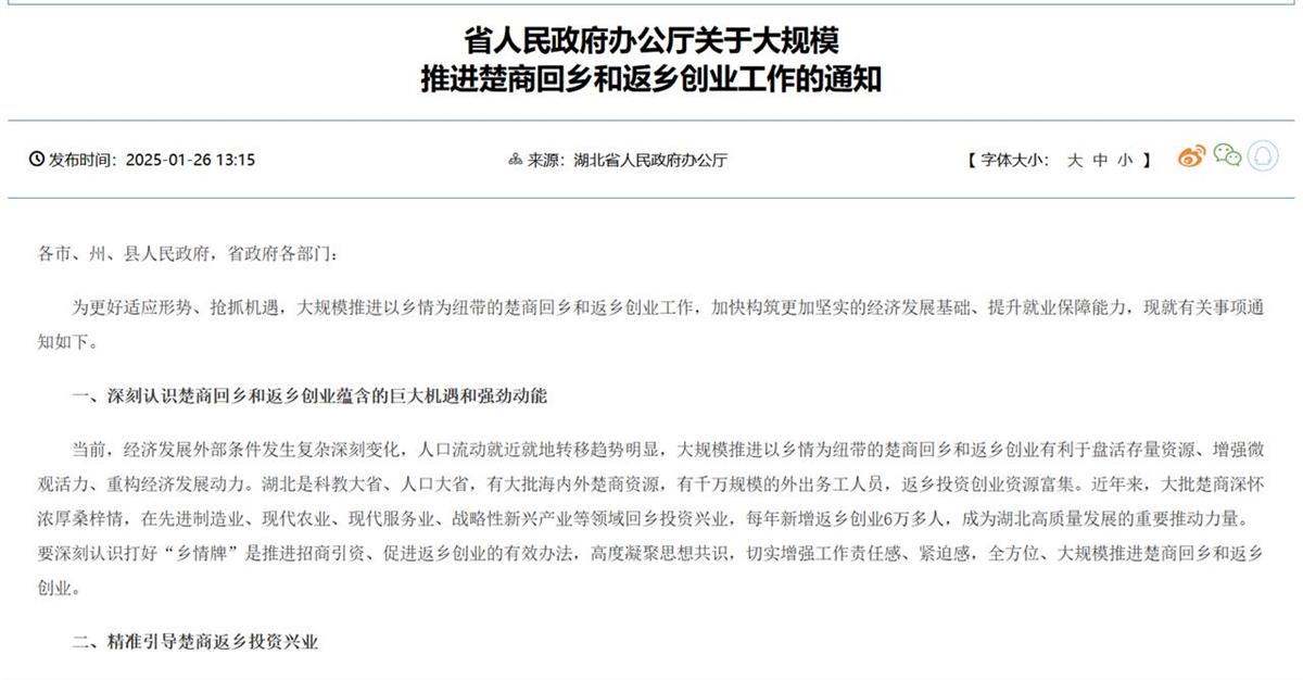 1月26日,湖北省发布《省人民政府办公厅关于大规模推进楚商回乡和返乡创业工作的通知》,通知显示,近年来,大批楚商深怀浓厚桑梓情,在先进制造业、现代农业、现代服务业、战略性新兴产业等领域回乡投资兴业,每年新增返乡创业6万多人,成为湖北高质量发展的重要推动力量。