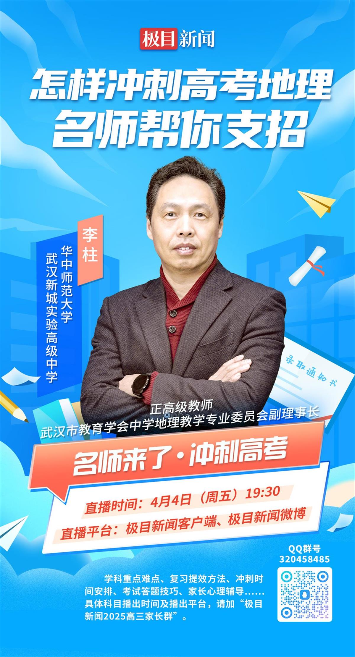 4月4日(周五)19:30,中学正高级教师、武汉市教育学会中学地理教学专业委员会副理事长、华中师范大学武汉新城实验高级中学校长李柱,将做客“名师来了·冲刺高考”地理专场节目,来为广大考生和家长讲解冲刺备考高考地理学科策略,梳理重要知识点。