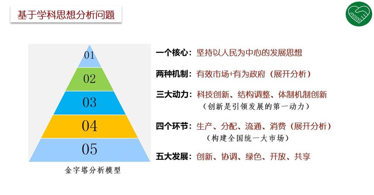 以经济板块为例,江老师详细介绍了构建理论模型的方法。他以优化资源配置、推动高质量发展为核心,构建了“12345金字塔分析模型”。这一模型以人民为中心的发展思想为核心,强调市场和政府两只手有机结合,点明科技创新、结构调整、体制机制改革创新三大动力因素,梳理出生产、分配、流通、消费四个环节以及创新、协调、绿色、开放、共享这五大发展理念的落实情况。